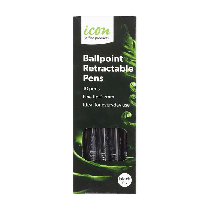 - Icon Retractable Ballpoint Pens are an economical pen ideal for everyday use at work, home or school. They have a high quality ink that is waterproof and fadeproof. The fine tip provides smooth ink flow to avoid scratching and blotting. Black. Fine tip 0.7mm. Pack of 10.